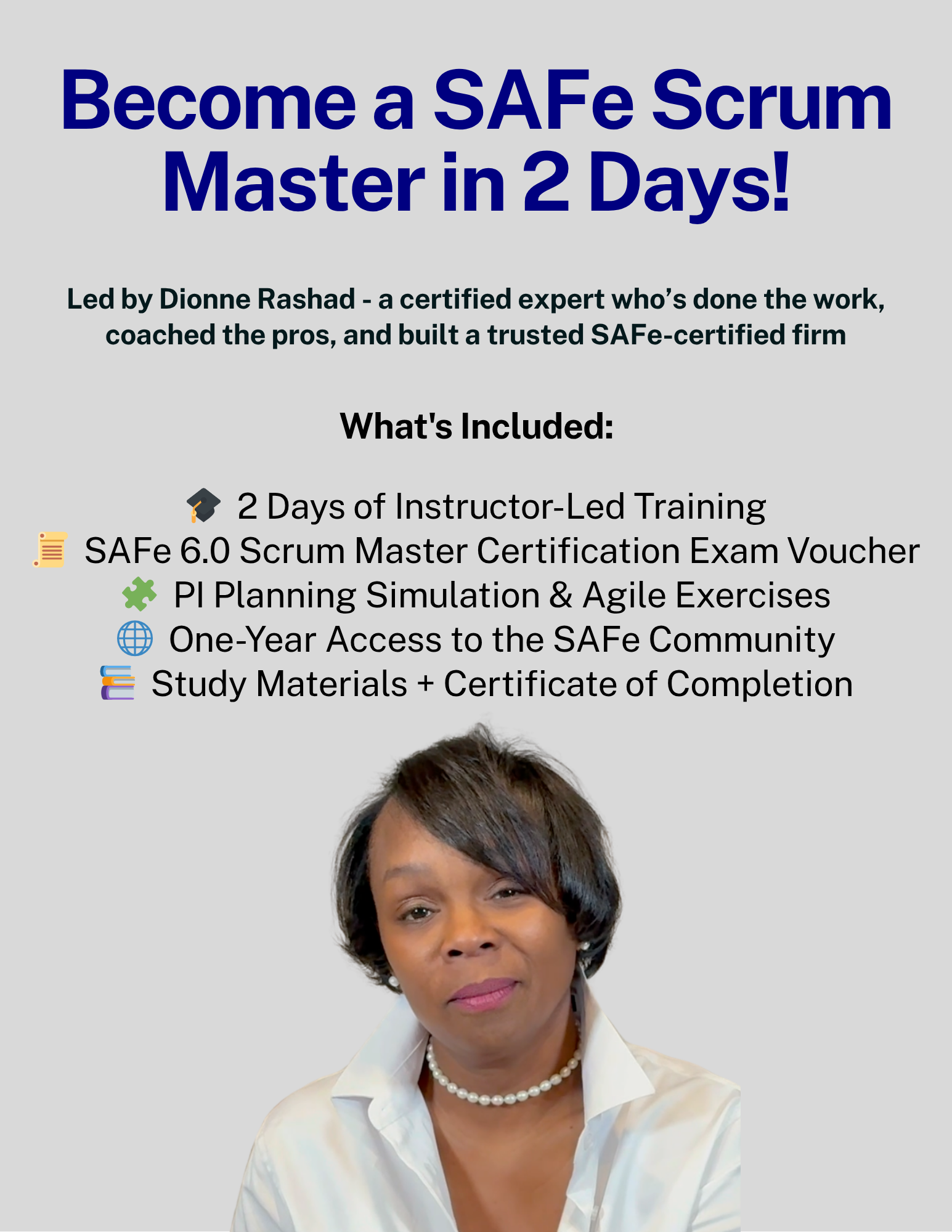 "Earning my SAFe Scrum Master certification was truly a transformative experience. I owe much of that to my amazing instructor, Dionne. Her deep knowledge of Agile principles, patient teaching style, and real-world insight made the material not only accessible but empowering. My salary increased by $40,000. This certification elevated my professional trajectory. I'm incredibly grateful for Dionne and highly recommend her."